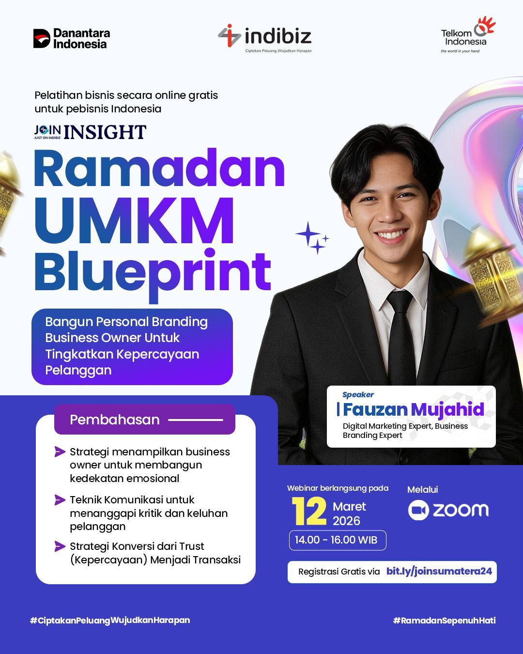 Webinar tersebut menghadirkan Digital Marketing dan Business Branding Expert, Fauzan Mujahid, sebagai pembicara utama. Dalam pemaparannya, Fauzan menjelaskan berbagai strategi membangun personal branding bagi pelaku usaha agar mampu meningkatkan kepercayaan pelanggan di tengah persaingan bisnis di era digital.